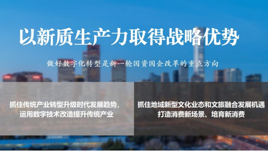 一是以新质生产力取得战略优势。如何实行数字化转型将会是新一轮国资国企改革的重点方向。在今年的首旅集团工作会上,我首次与全体管理人员提出,要利用好数字化、城市更新等方面的政策窗口期,锚定传统产业的转型升级,以数字化、智能化为目标,实行老旧项目更新改造和新项目建设的整体规划布局。抓住传统产业转型升级的时代开展趋势,运用数字技术改造提升传统产业。同时,抓住地域新型文化业态和文旅融合开展的新机遇,持续研究运用人工智能、虚拟现实、数字孪生等新技术,打造沉浸式的交互新场景,培育新消费。这是我们取得的战略优势。