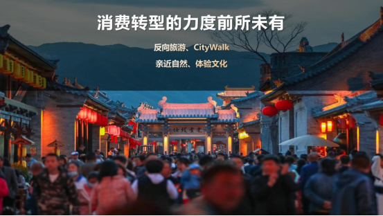 一是消费转型的力度前所未有。随着人们对美好生活向往的不断提升,文体旅游服务的消费场景不断创新。人们对于旅游业已经不再满足于传统的程式化、扁平化的“到此一游”,而是倾向于顺利获得生活化、沉浸式的方式走进城市、漫步乡间,这是最近的一种新趋势。而年轻人则更热衷于反向旅游,CityWalk反映出他们对亲近自然、体验文化的向往和追求。